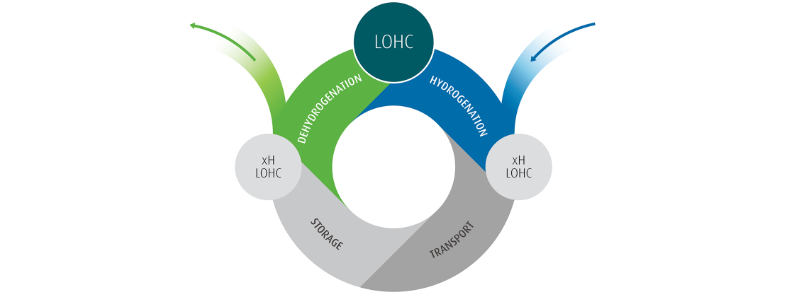 Green hydrogen – hydrogen created using renewable energy sources –  is expected to be an important element in a future carbon-neutral economy. However, the transportation and storage of hydrogen is today mainly based on liquid compressed hydrogen, which has to be stored either at extremely high pressures (350-700 bar) or at extremely low temperatures (-253°C). The need for specialised handling and the insufficient infrastructure and refuelling networks for compressed hydrogen represent the main challenges for a more widespread use of hydrogen in the transport sector. Liquid Organic Hydrogen Carrier (LOHC) technologies provide an effective alternative solution by chemically bonding hydrogen to a stable organic liquid carrier, thereby eliminating the need for compression and making it safer, more practical and more cost-efficient to transport hydrogen using existing conventional fuel networks.