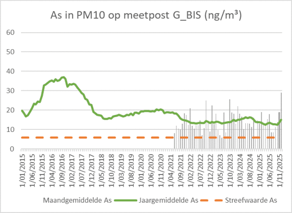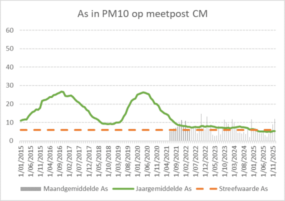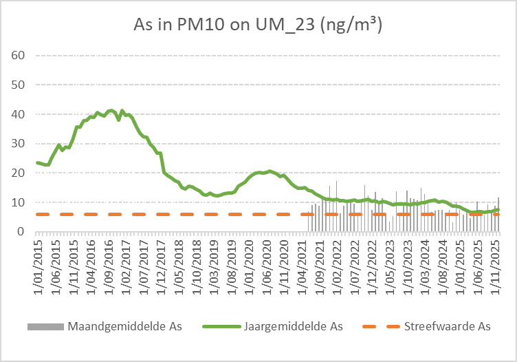 De Europese streef- of richtwaarde voor arseen in fijn zwevend stof is 6 nanogram per kubieke meter lucht. Een nanogram is een miljardste deel van een gram. Deze richtwaarde halen we helaas nog niet. Het is natuurlijk onze prioriteit om de richtwaarde te behalen.