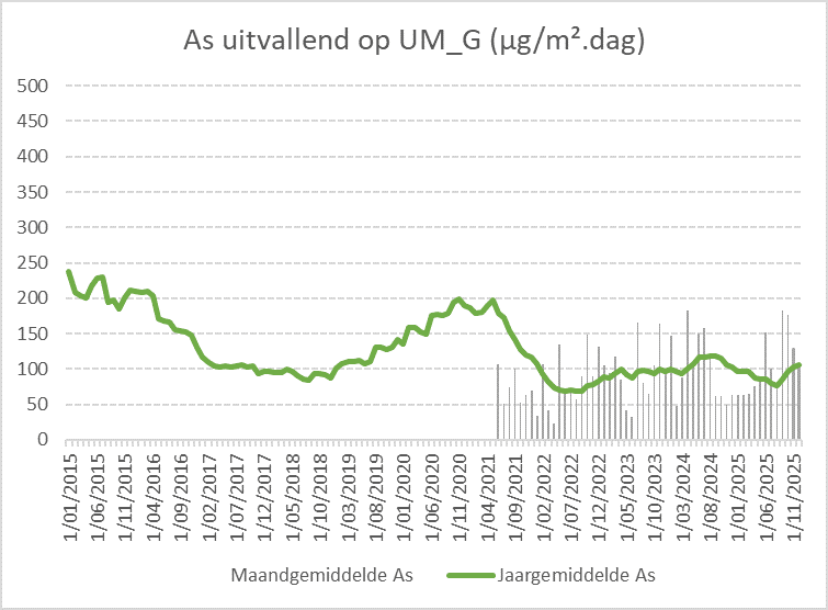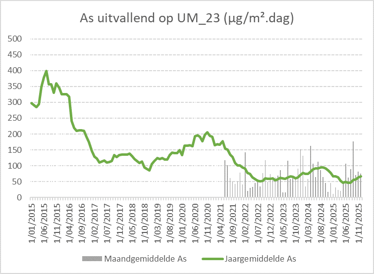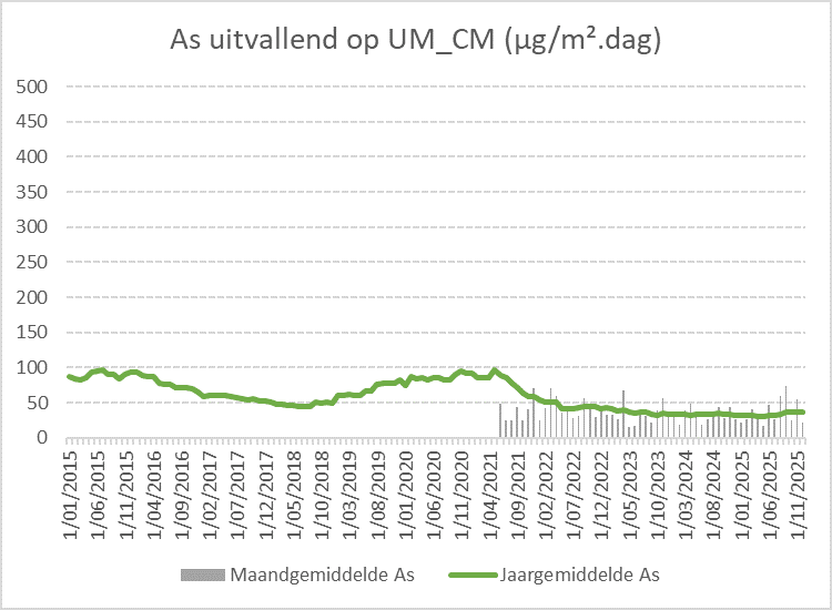 Hier publiceren we elke maand een update van de glijdende jaargemiddelden (dus het gemiddelde van telkens de laatste twaalf maanden) en het maandgemiddelde van onze metingen van arseen in grof uitvallend stof en fijn zwevend stof.