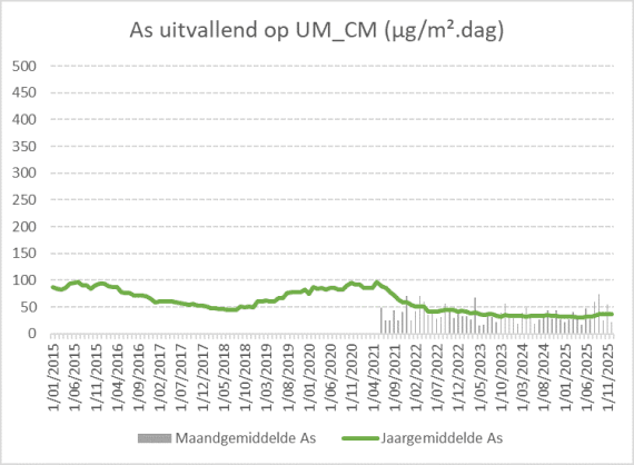 Arseen (As) in grof uitvallend stof op meetpunten G, CM en 23 tot en met december 2025