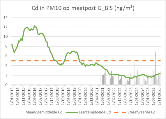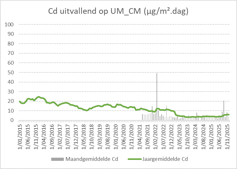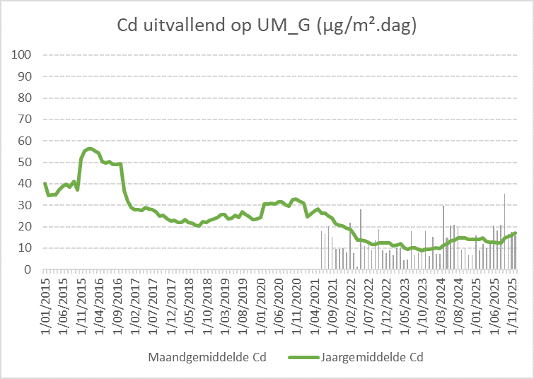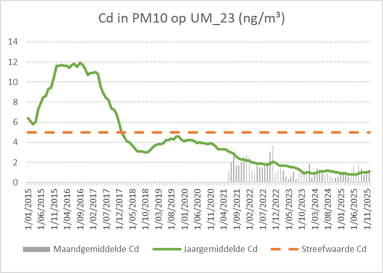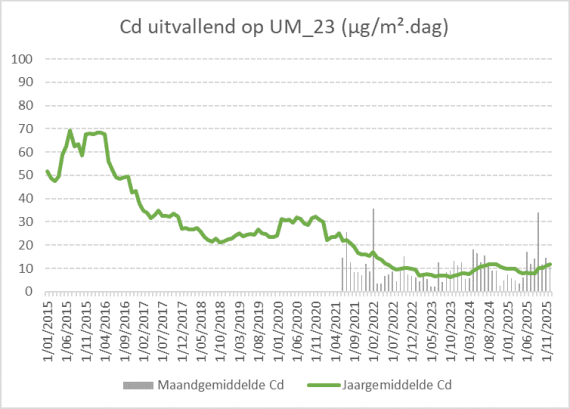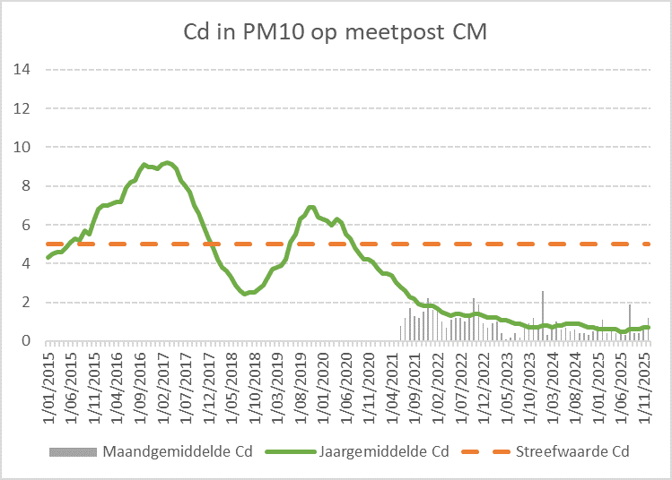 Voor cadmium in grof uitvallend stof bestaat er geen grens- of streefwaarde voor een individueel meetpunt. Er is wel een streef- of richtwaarde voor het gemiddelde van het meetnet van de Vlaamse Milieumaatschappij, en daar voldoen we aan.