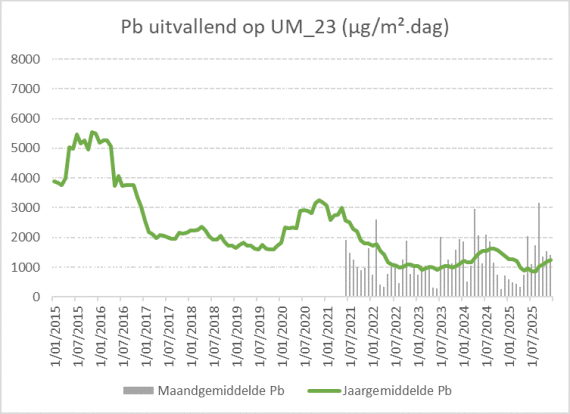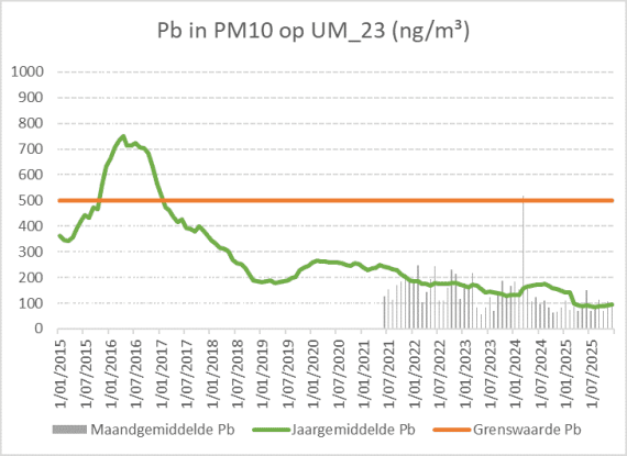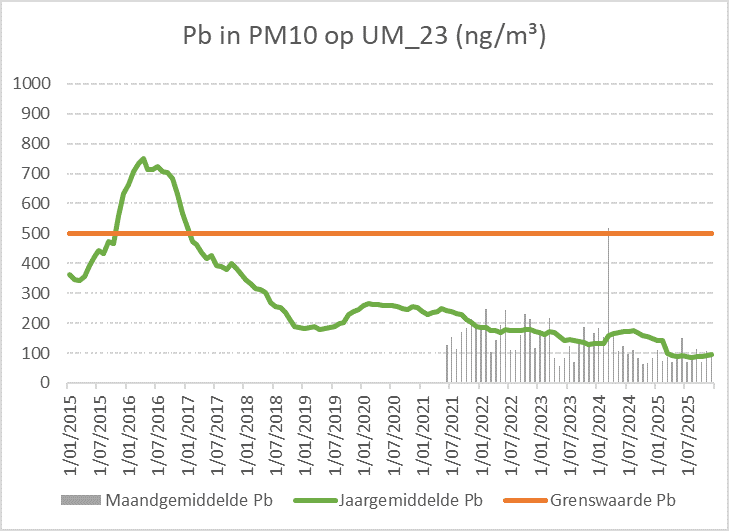 Voor lood in grof uitvallend stof bestaat er geen grens- of streefwaarde. Er is echter wel een grens- en streefwaarde voor het gemiddelde van het meetnet van de Vlaamse Milieumaatschappij in de omgeving. Hoewel we onder die grenswaarde zitten, behalen we nog niet de streef- of richtwaarde.