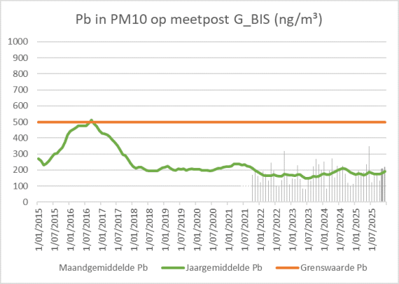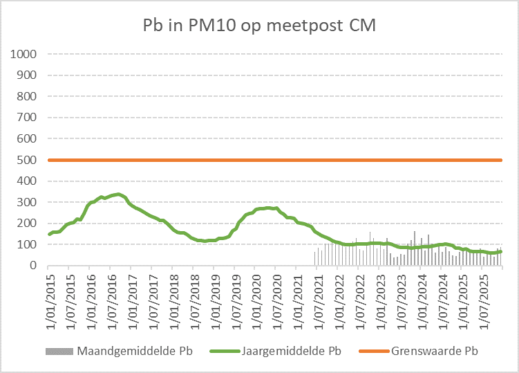 De Vlaamse overheid legt voor het glijdend jaargemiddelde van lood in fijn zwevend stof (PM10) een grenswaarde op van 500 nanogram per kubieke meter. Een nanogram is een miljardste deel van een gram. We blijven al geruime tijd onder deze grenswaarde.