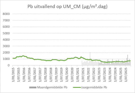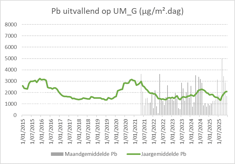 Hier publiceren we elke maand een update van de glijdende jaargemiddelden (dus het gemiddelde van telkens de laatste 365 dagen) en het maandgemiddelde van onze metingen van lood in grof uitvallend stof en fijn zwevend stof.