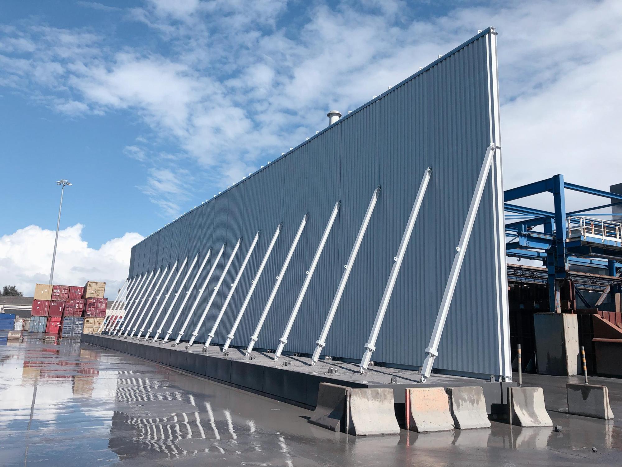We plaatsten aan onze containerkade een geluidsscherm van 50 m lang en 10 m hoog om zogenaamde ‘hindergeluiden’, zoals kloppen, boren en bonken, beter op te vangen. De positie van het scherm is zo gekozen dat het dempende effect maximaal is, terwijl ons interne verkeer er nog altijd makkelijk kan passeren en manoeuvreren.