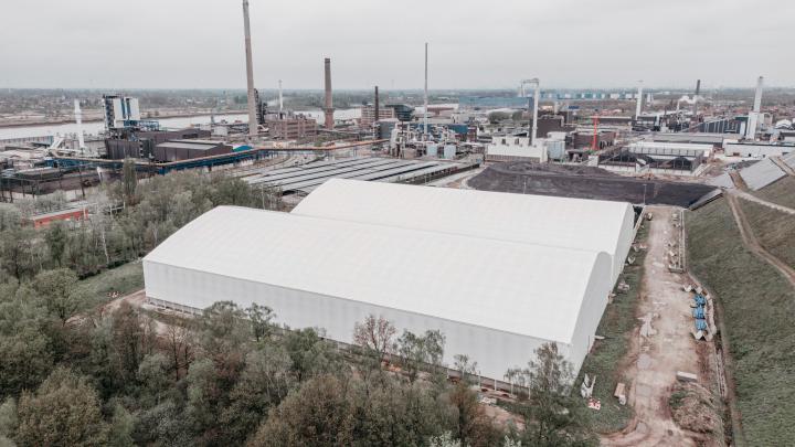 Onze tussenproducten en grondstoffen stockeren we in opslagplaatsen. Sinds 2021 gebruiken we bijvoorbeeld twee hallen van elk 5.000 vierkante meter, dus 10.000 vierkante meter in totaal, die beide overdekt zijn met een brandveilig zeil.
