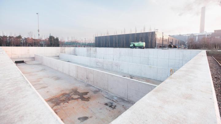 Regenwater vangen we op in twee tanks met een totale buffercapaciteit van 30.000 m³. Bij extreme regenval – dat gebeurt zo'n één tot vijf keer per jaar – volstaat deze opslag echter niet. Om overstromingen te voorkomen, werd eind 2022 een bufferbekken van 2.000 m³ in gebruik genomen bij de groene zone op de site. Bij extreme regenval vult het bekken zich met het teveel aan water uit het rioleringssysteem en het afwateringssysteem. Dat water wordt vervolgens gecontroleerd afgevoerd naar onze waterzuiveringsinstallatie.